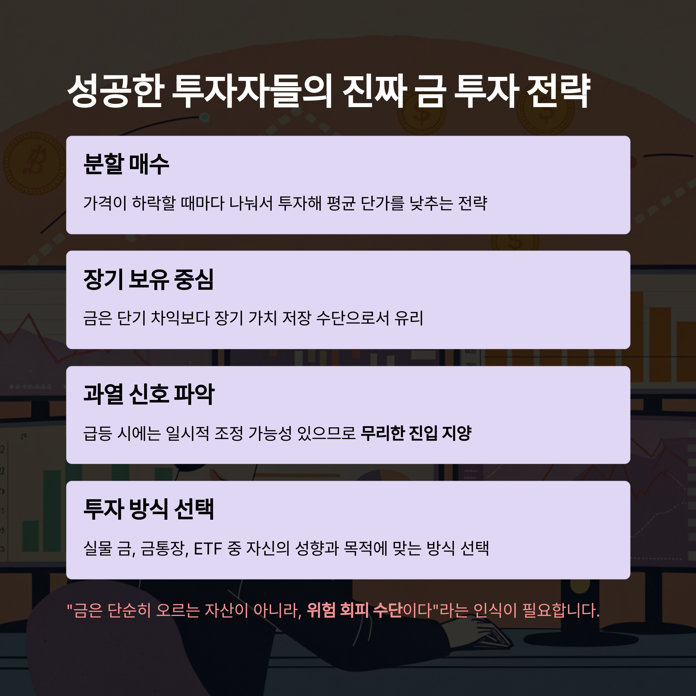 금 투자 경험자들이 공통으로 강조하는 성공 전략은 다음과 같습니다.
