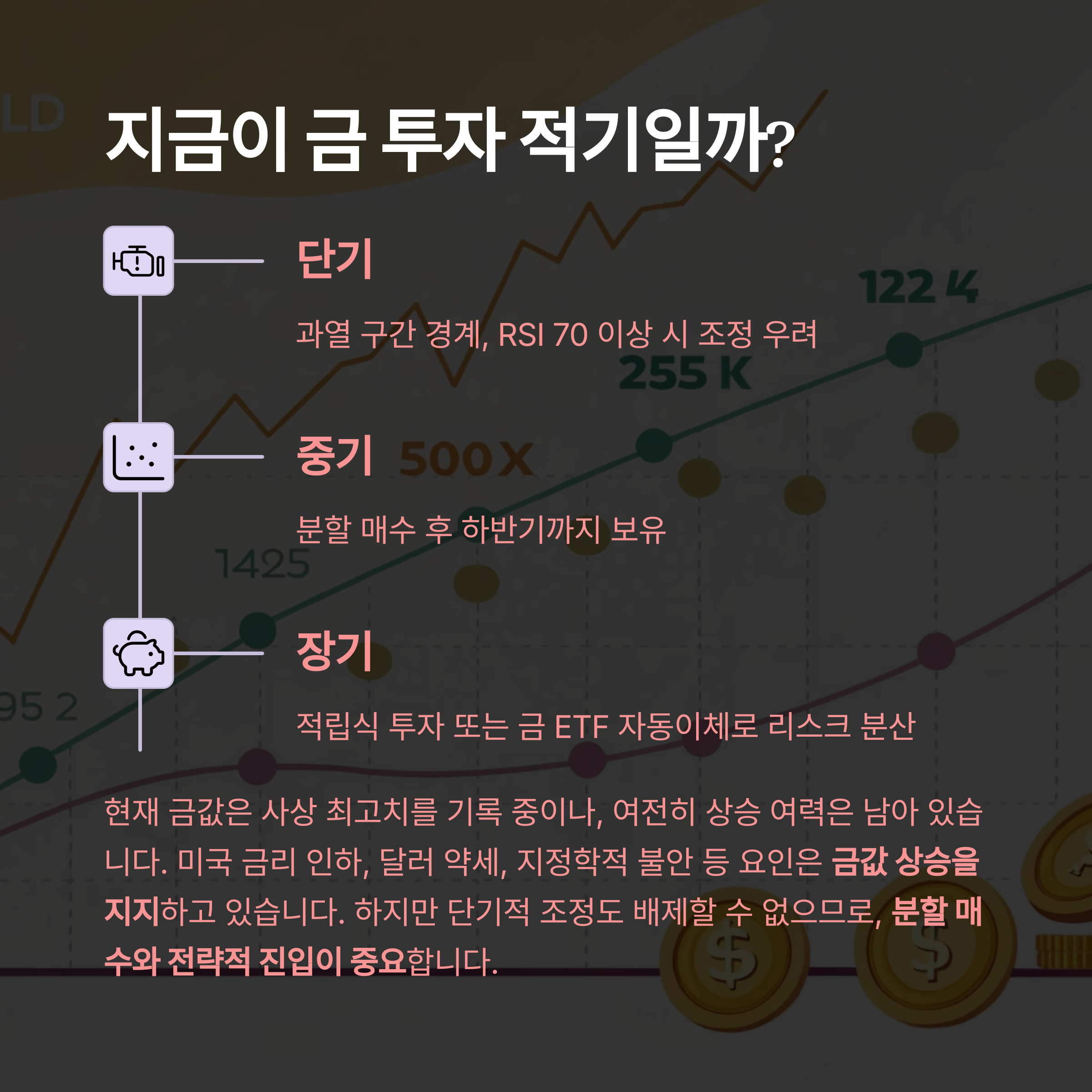 | 장기 | 적립식 투자 또는 금 ETF 자동이체로 리스크 분산 |