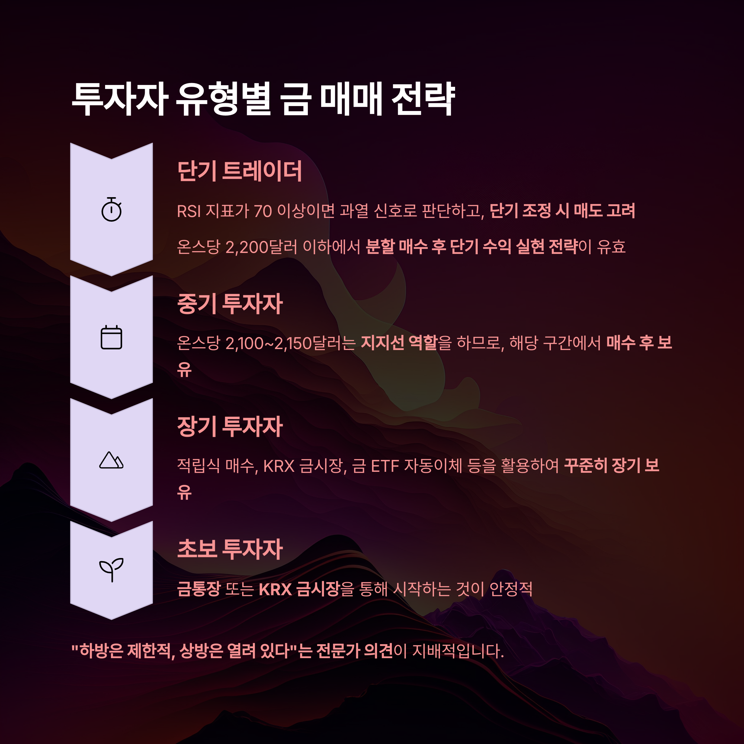 RSI 지표가 70 이상이면 과열 신호로 판단하고, 단기 조정 시 매도 고려 온스당 2,200달러 이하에서 분할 매수 후 단기 수익 실현 전략이 유효