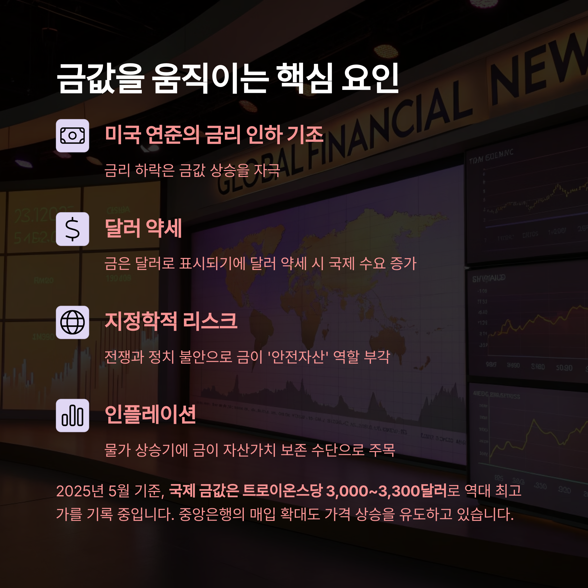 미국 금리 인하, 달러 약세, 지정학적 불안 등 요인은 금값 상승을 지지하고 있습니다.