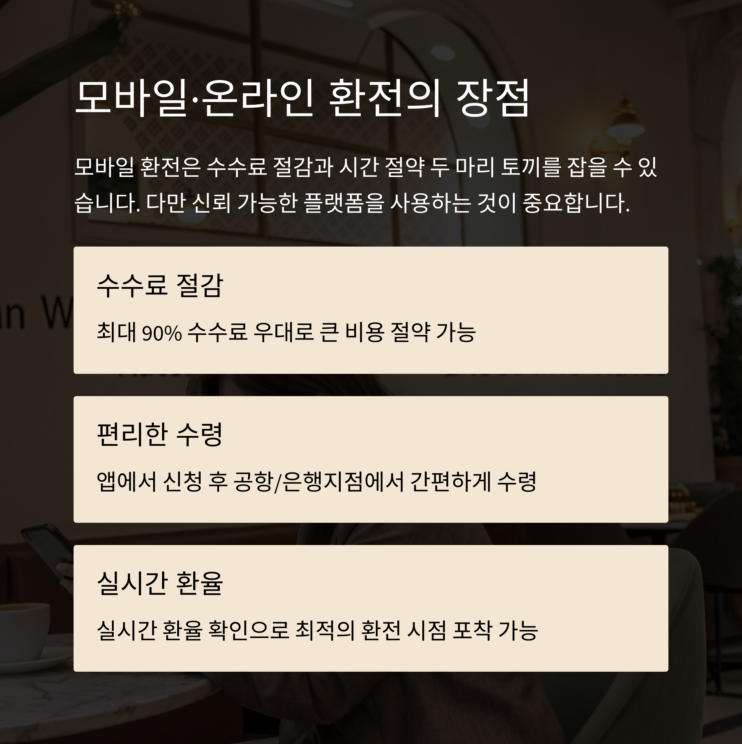 모바일 환전은 수수료 절감과 시간 절약 두 마리 토끼를 잡을 수 있습니다.