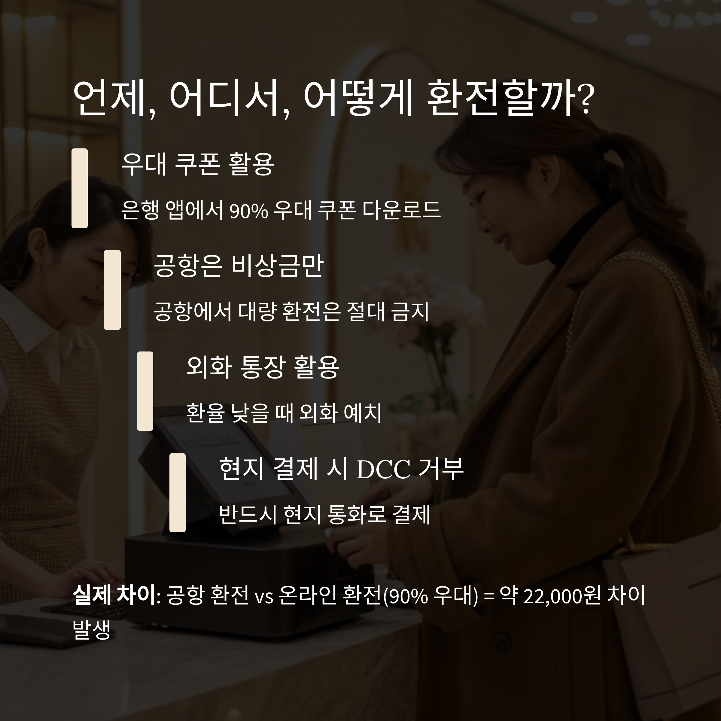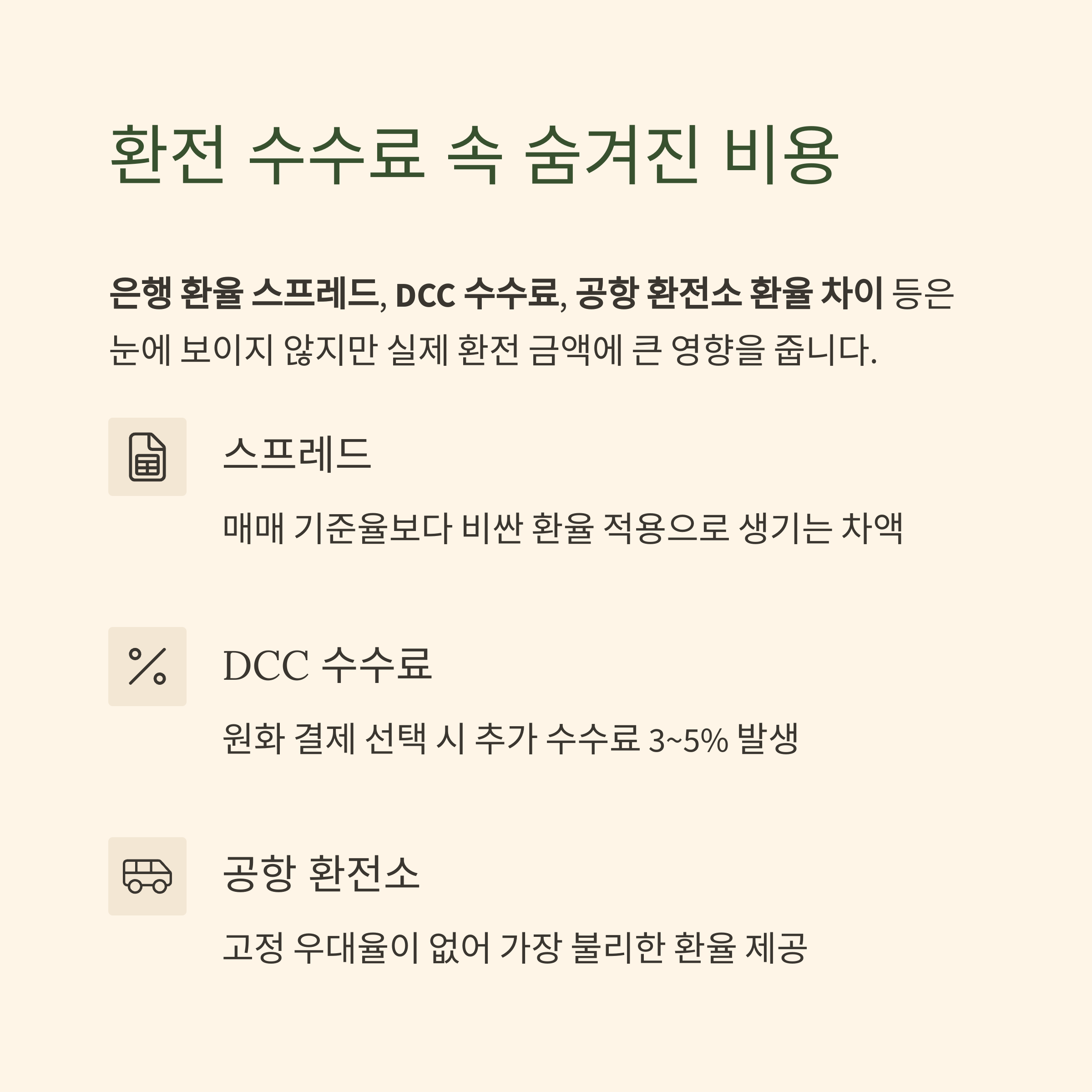 은행 환율 스프레드, DCC 수수료, 공항 환전소 환율 차이 등은 눈에 보이지 않지만 실제 환전 금액에 큰 영향을 줍니다. 이를 피하기 위한 몇 가지 꿀팁을 소개합니다.