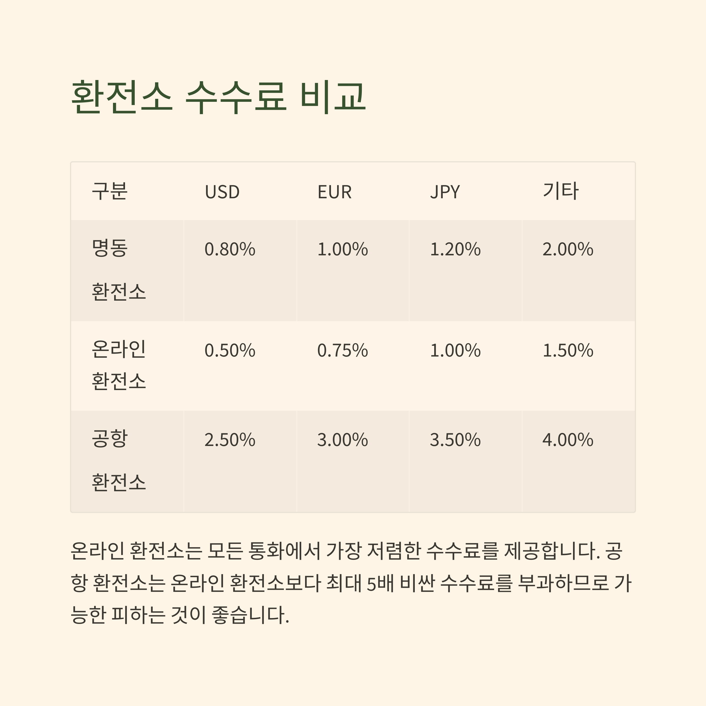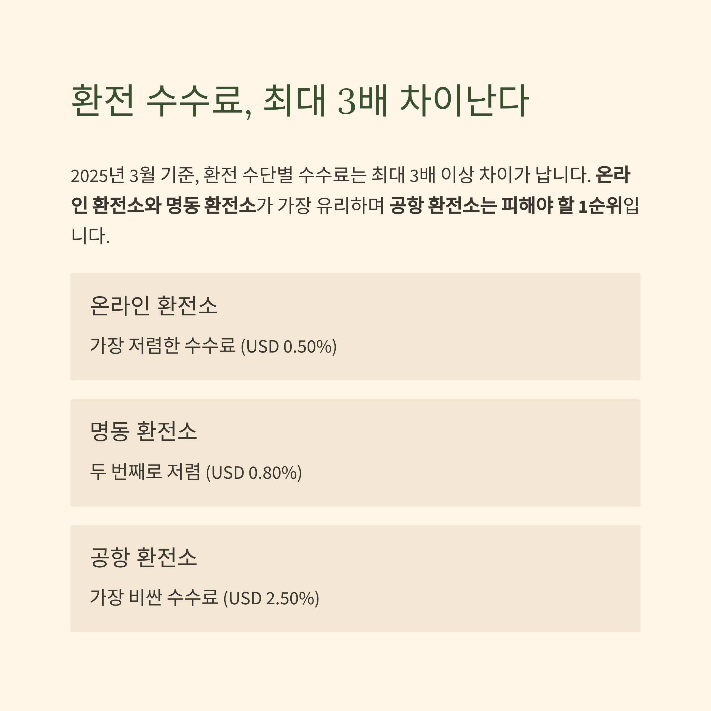 2025년 3월 기준으로 각 수단의 수수료를 비교한 결과, 온라인 환전소와 명동 환전소가 가장 유리하며 공항 환전소는 피해야 할 1순위라는 결론이 나왔습니다.