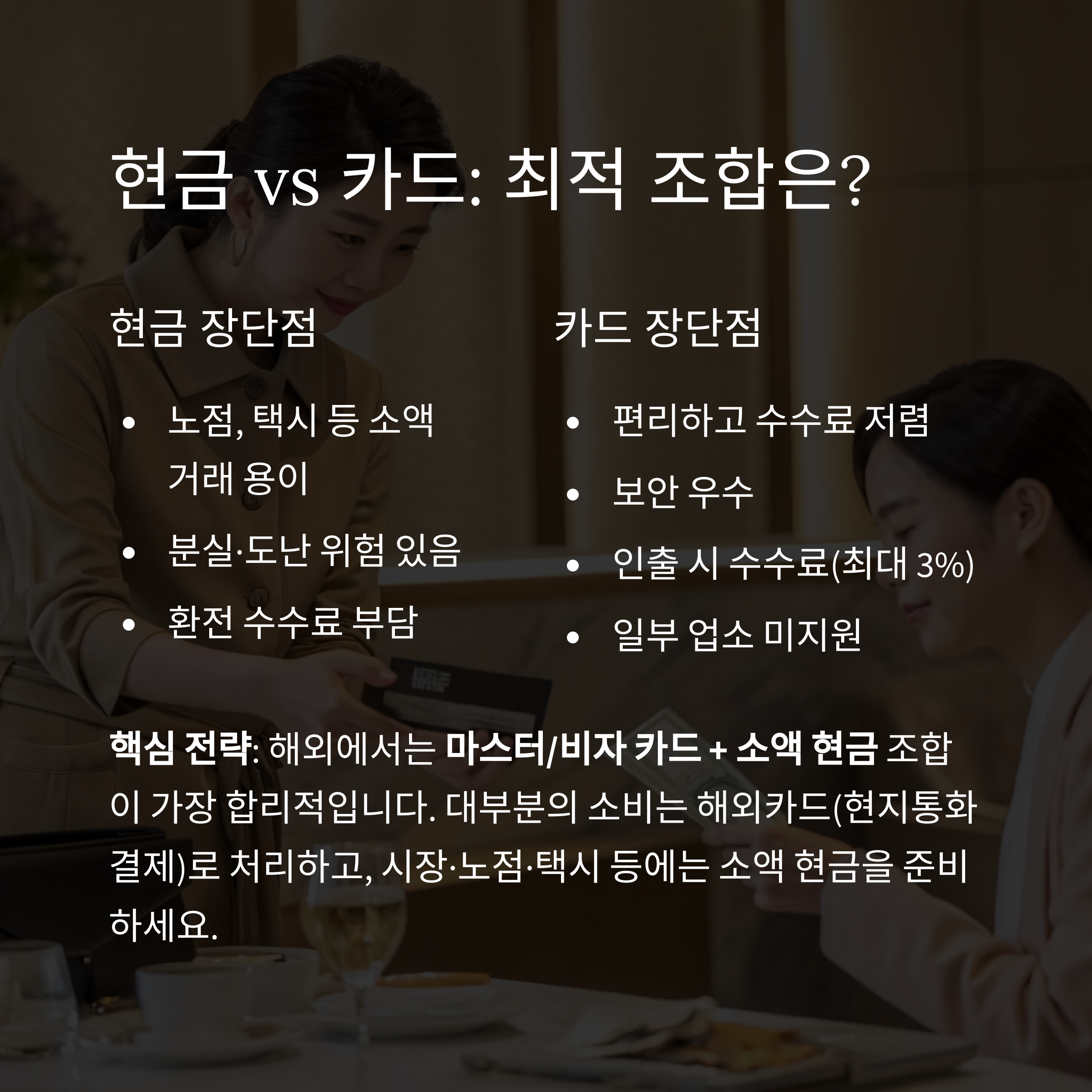 대부분의 소비는 해외카드(현지통화 결제)로 처리하고, 시장·노점·택시 등에는 소액 현금을 준비하는 전략이 가장 유리합니다.