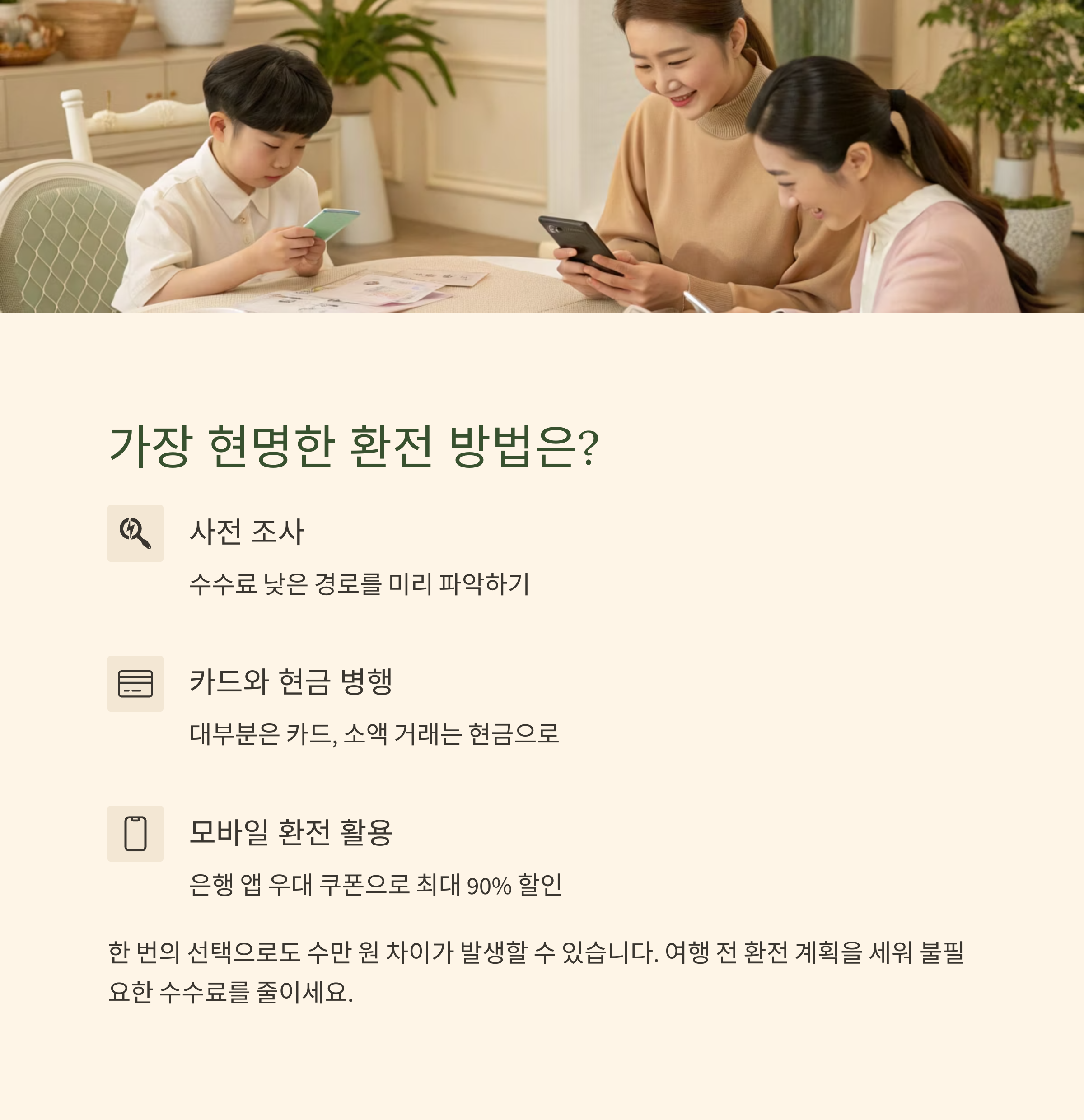 2025년 환전 수수료 절약의 핵심은 수수료 낮은 경로를 사전에 파악하고, 카드와 소액 현금을 병행하며, 모바일 환전 서비스를 최대한 활용하는 것입니다.