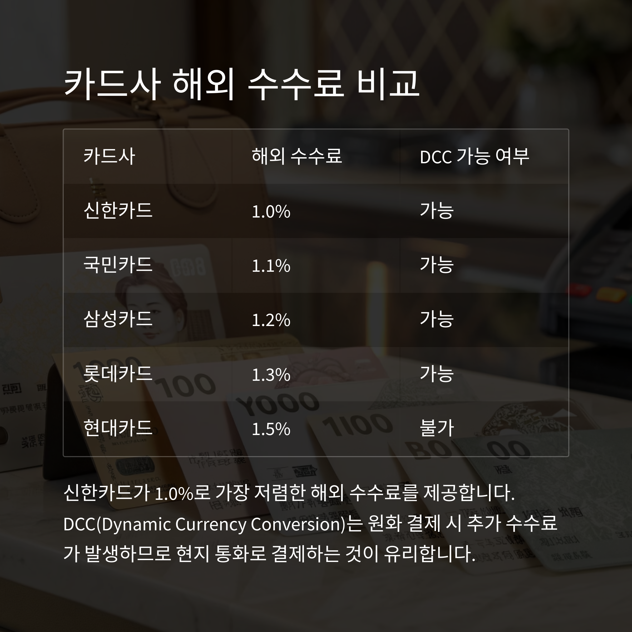 - DCC 수수료: 원화 결제 선택 시 추가 수수료 3~5% 발생