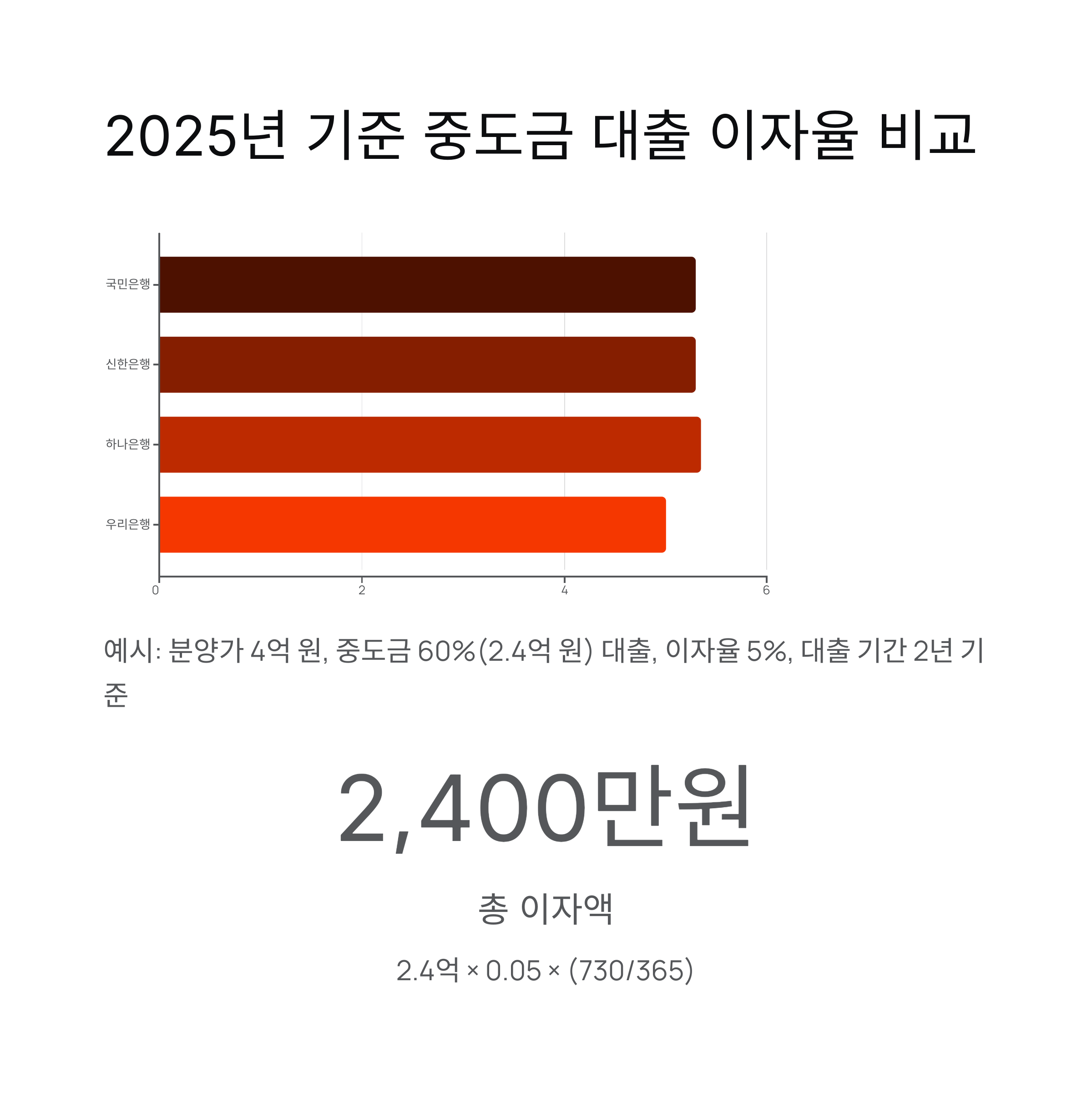 공식: 대출금 × 이자율 × (대출일수 / 365) = 2.4억 × 0.05 × (730 / 365)
