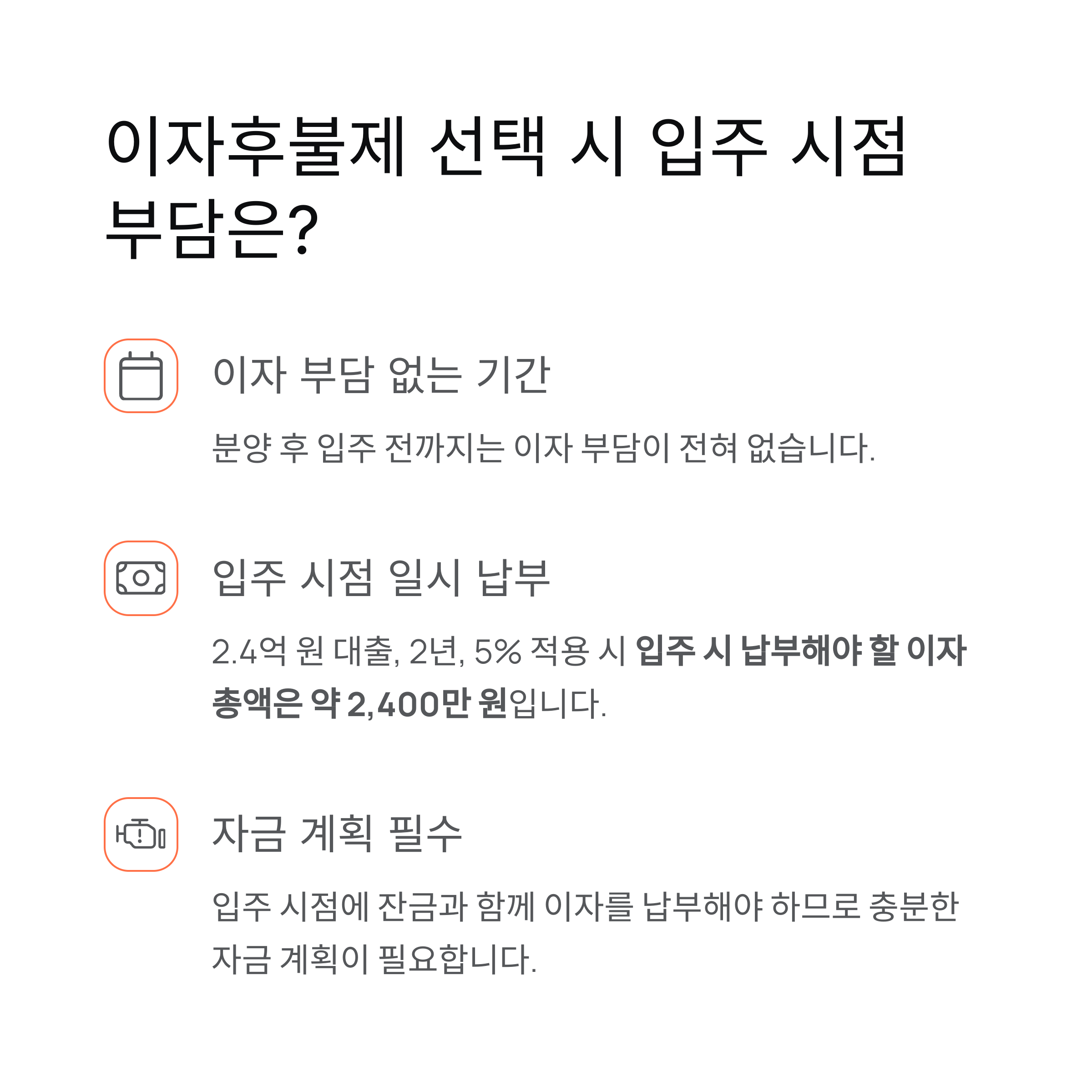 하지만 입주 시점에 모든 이자를 한꺼번에 납부해야 하므로 자금 마련이 늦어지거나 다른 지출과 겹치면 부담이 커질 수 있습니다.