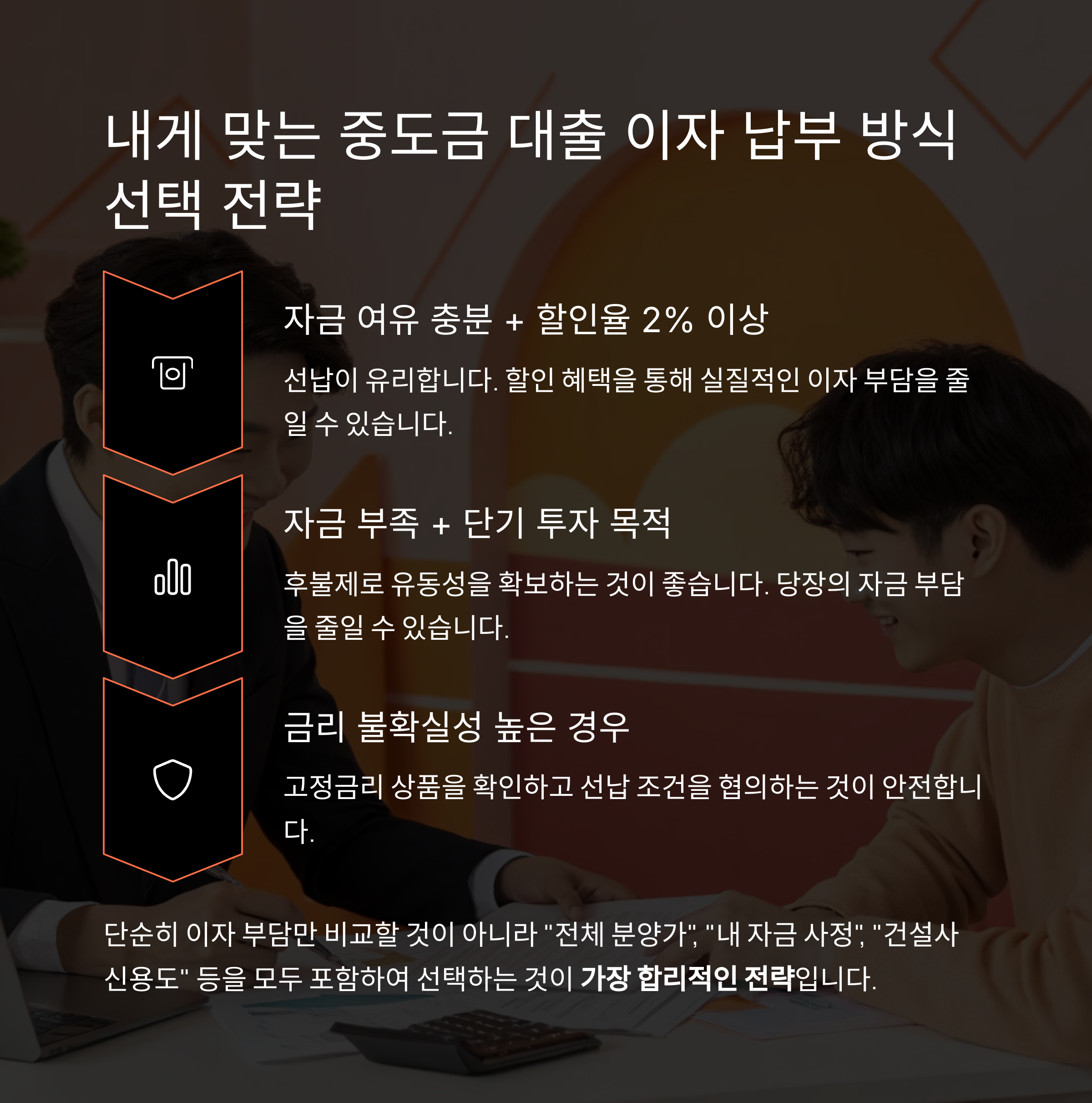 이처럼 단순히 이자 부담만 비교할 것이 아니라 "전체 분양가", "내 자금 사정", "건설사 신용도" 등을 모두 포함하여 선택하는 것이 가장 합리적인 전략입니다.