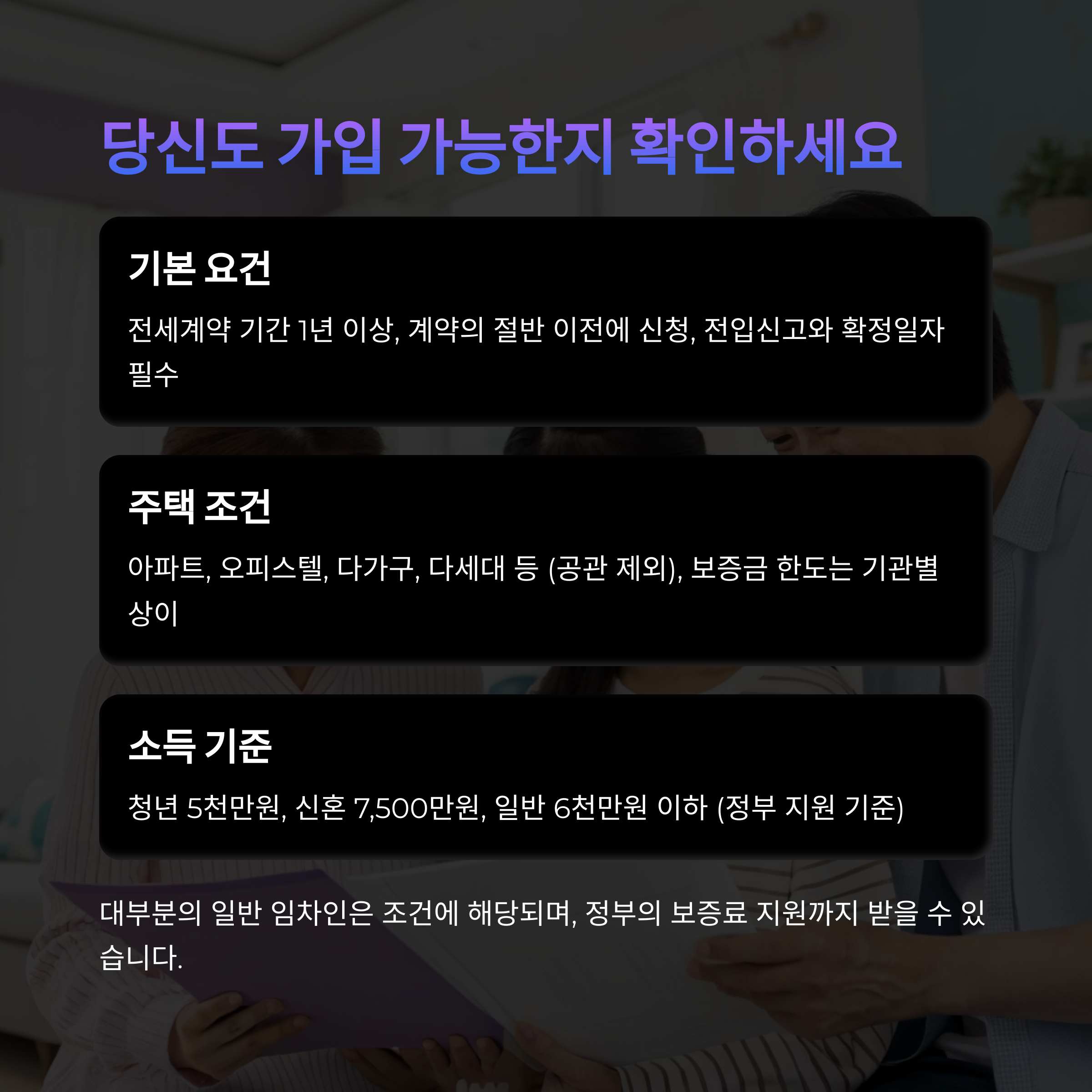 대부분의 일반 임차인은 조건에 해당되며, 정부의 보증료 지원까지 받을 수 있습니다.