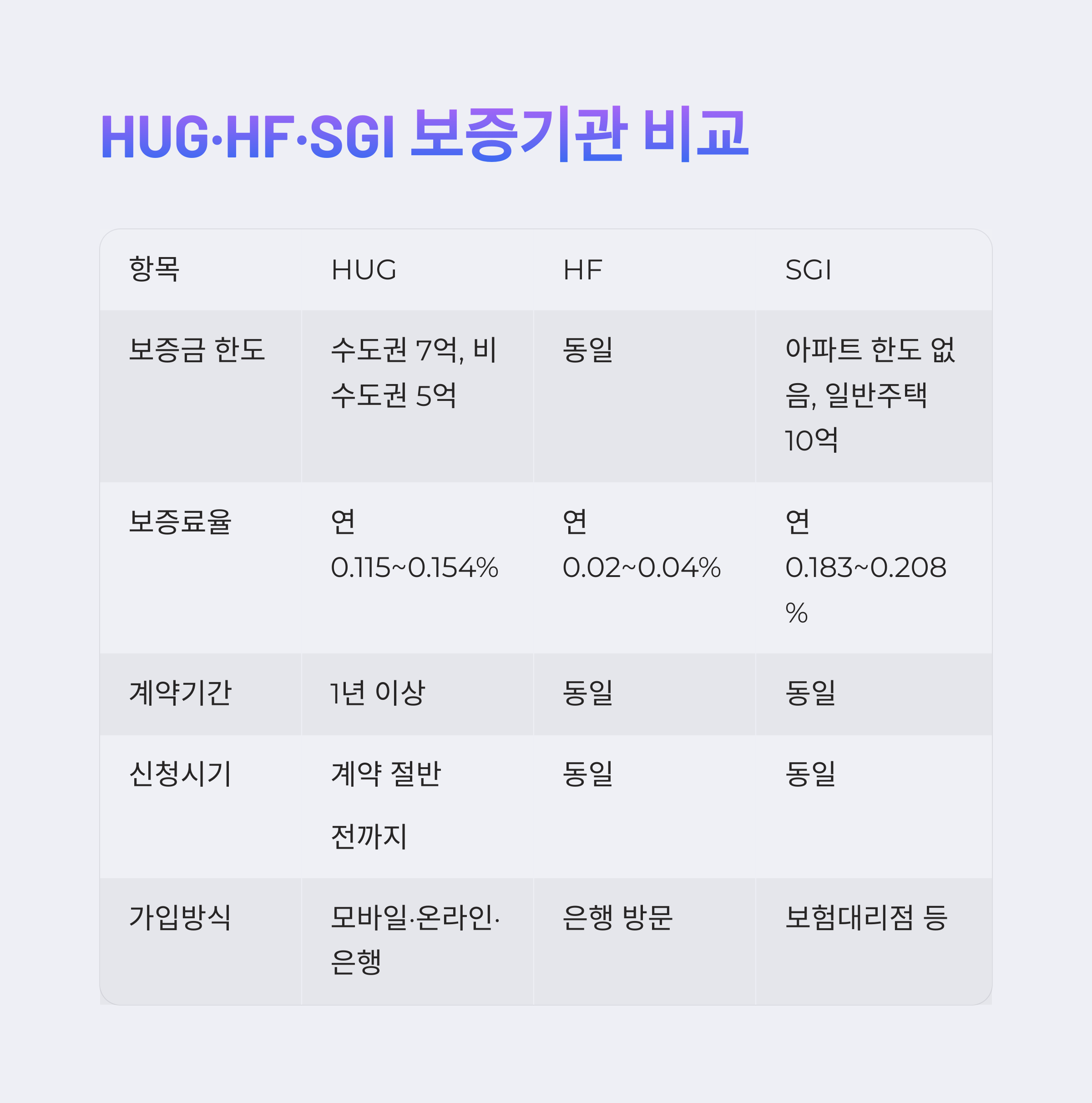 특히 HUG, HF, SGI 등 각 기관은 보증료와 한도, 가입 방식에서 차이를 보이며, 상황에 따라 유리한 기관을 선택할 수 있는 기준이 명확해졌습니다.