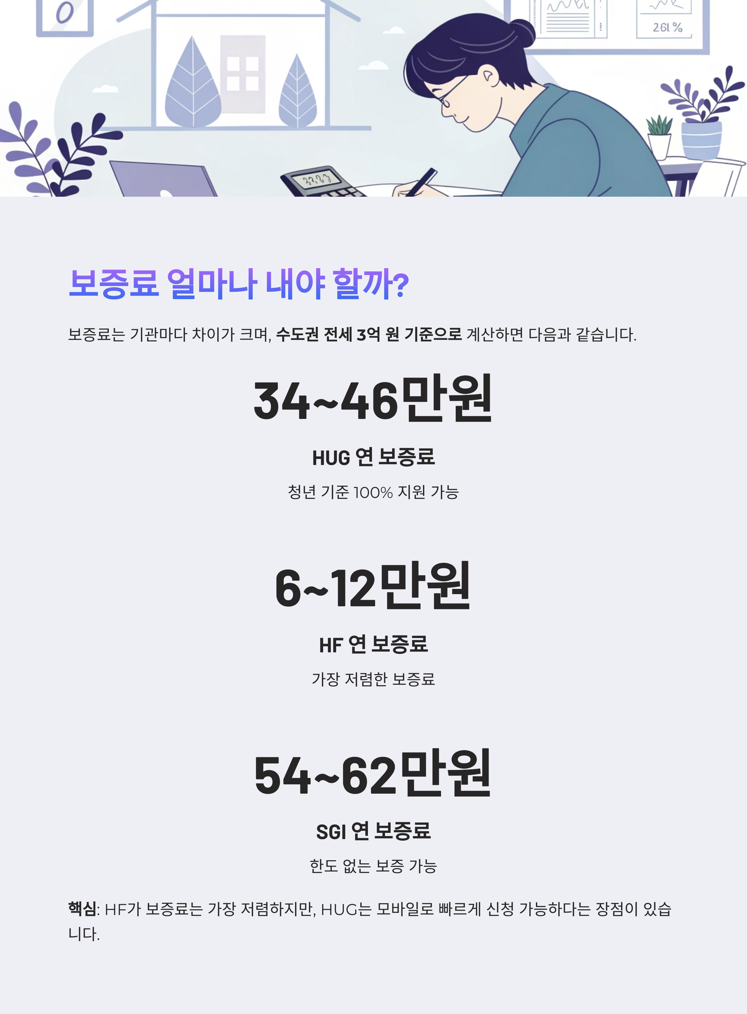 핵심: HF가 보증료는 가장 저렴하지만, HUG는 모바일로 빠르게 신청 가능하다는 장점이 있습니다.