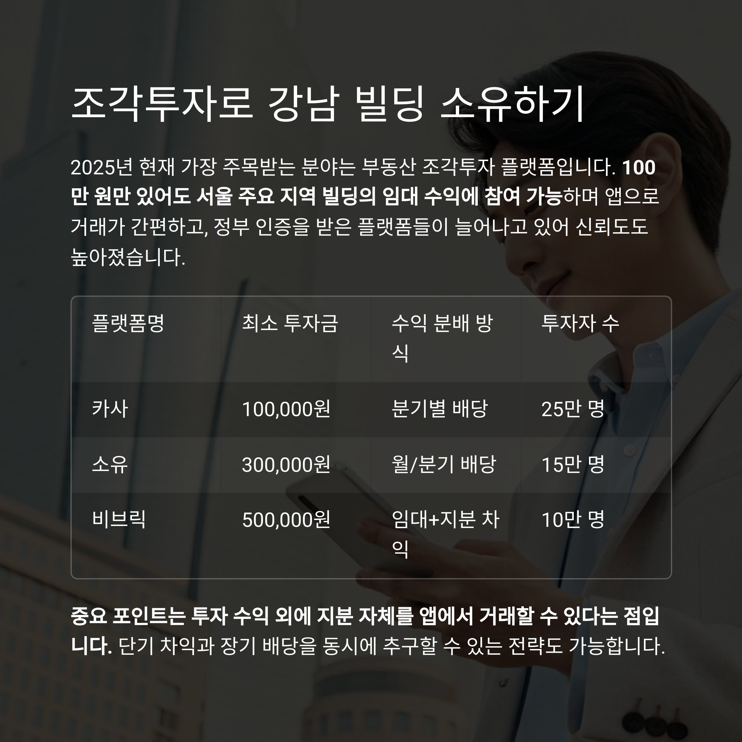 100만 원만 있어도 서울 주요 지역 빌딩의 임대 수익에 참여 가능하며 앱으로 거래가 간편하고, 정부 인증을 받은 플랫폼들이 늘어나고 있어 신뢰도도 높아졌습니다.