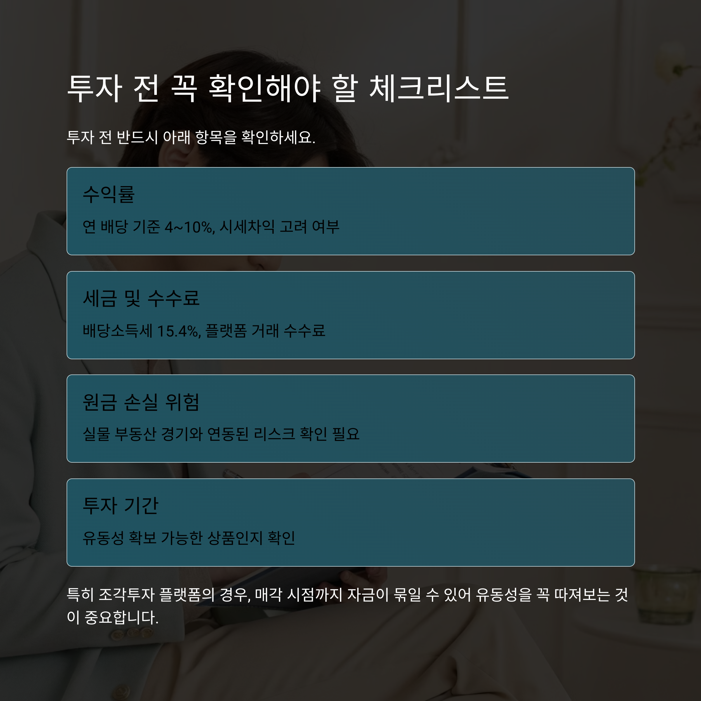 | 원금 손실 위험 | 실물 부동산 경기와 연동된 리스크 확인 필요 |