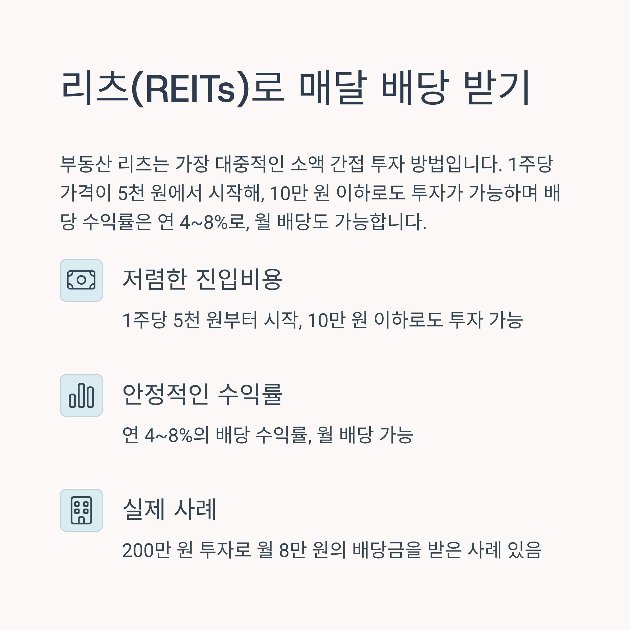 1주당 가격이 5천 원에서 시작해, 10만 원 이하로도 투자가 가능하며 배당 수익률은 연 4~8%로, 월 배당도 가능합니다.