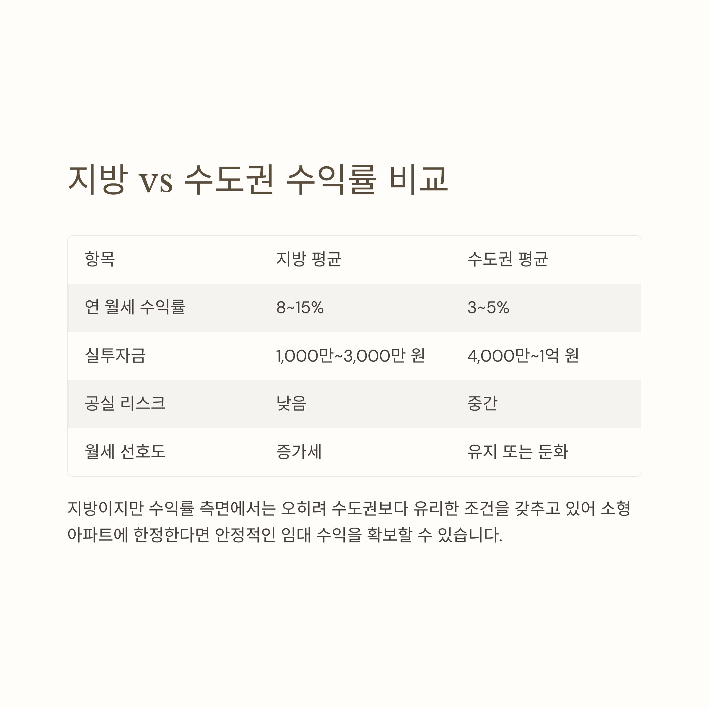 지방은 인구 감소라는 흐름 속에서도 1인 가구, 고령층, 청년층을 중심으로 월세 수요가 유지되고 있으며 이는 소형 주택에 대한 임대 시장 수요로 직결되고 있습니다.